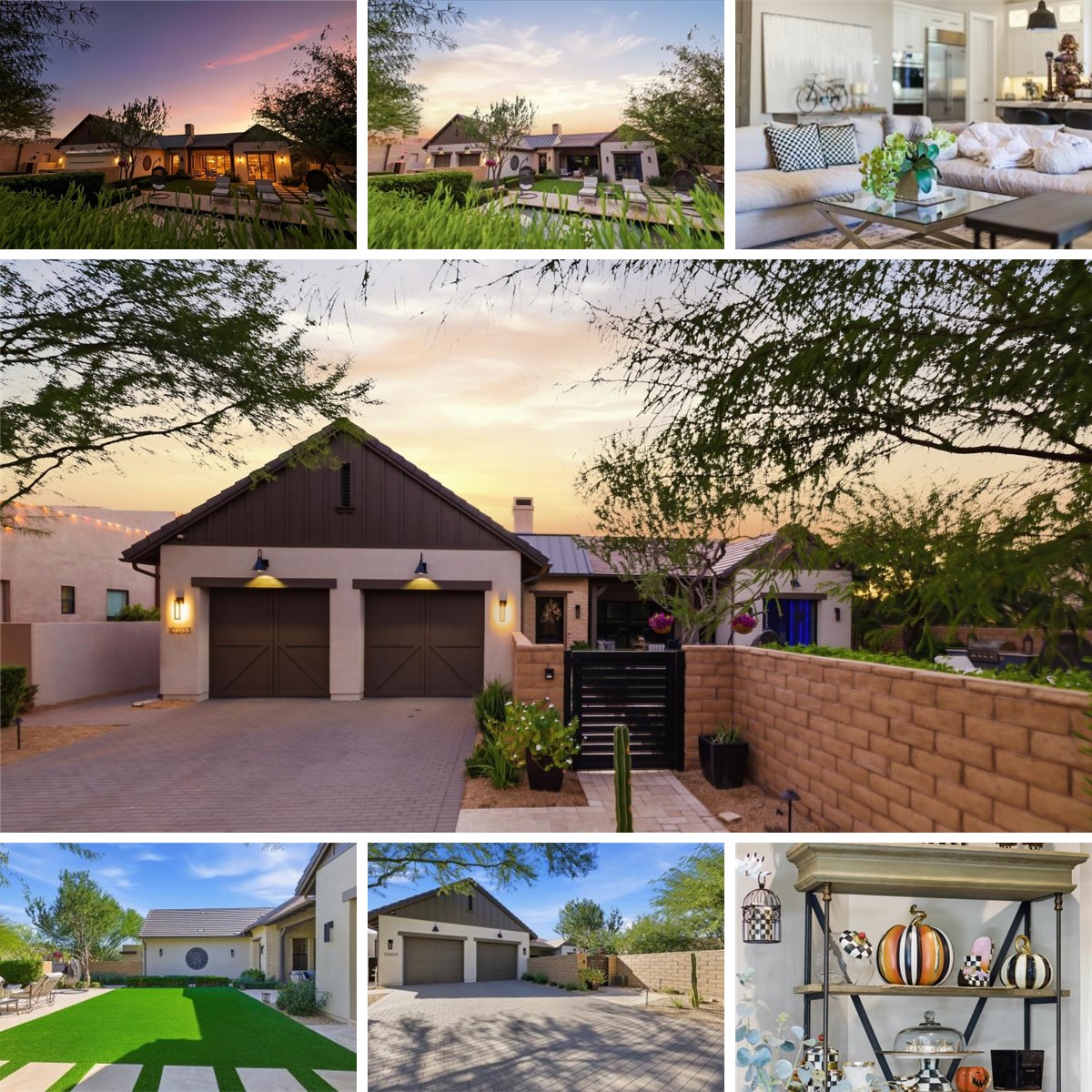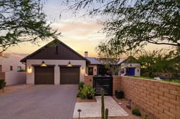 This expansive Scottsdale residence boasts a thoughtful layout across 3,500 sq. ft. The single-story design seamlessly blends modern aesthetics with functional living spaces. The home features 3 bedrooms, including a sprawling 340 sq. ft. primary suite, and 4 bathrooms. The open-concept living area showcases a sleek fireplace, large TV, and designer lighting. The kitchen impresses with extensive cabinetry, high-end appliances, and ample natural light.